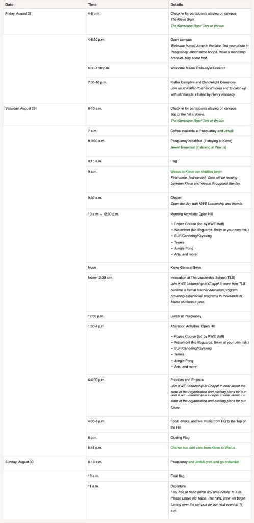 ***All activities at Kieve unless highlighted in green. If you are housed at Wavus, the campus and waterfront will be open for your enjoyment, but will not host meals or official activities unless noted below.